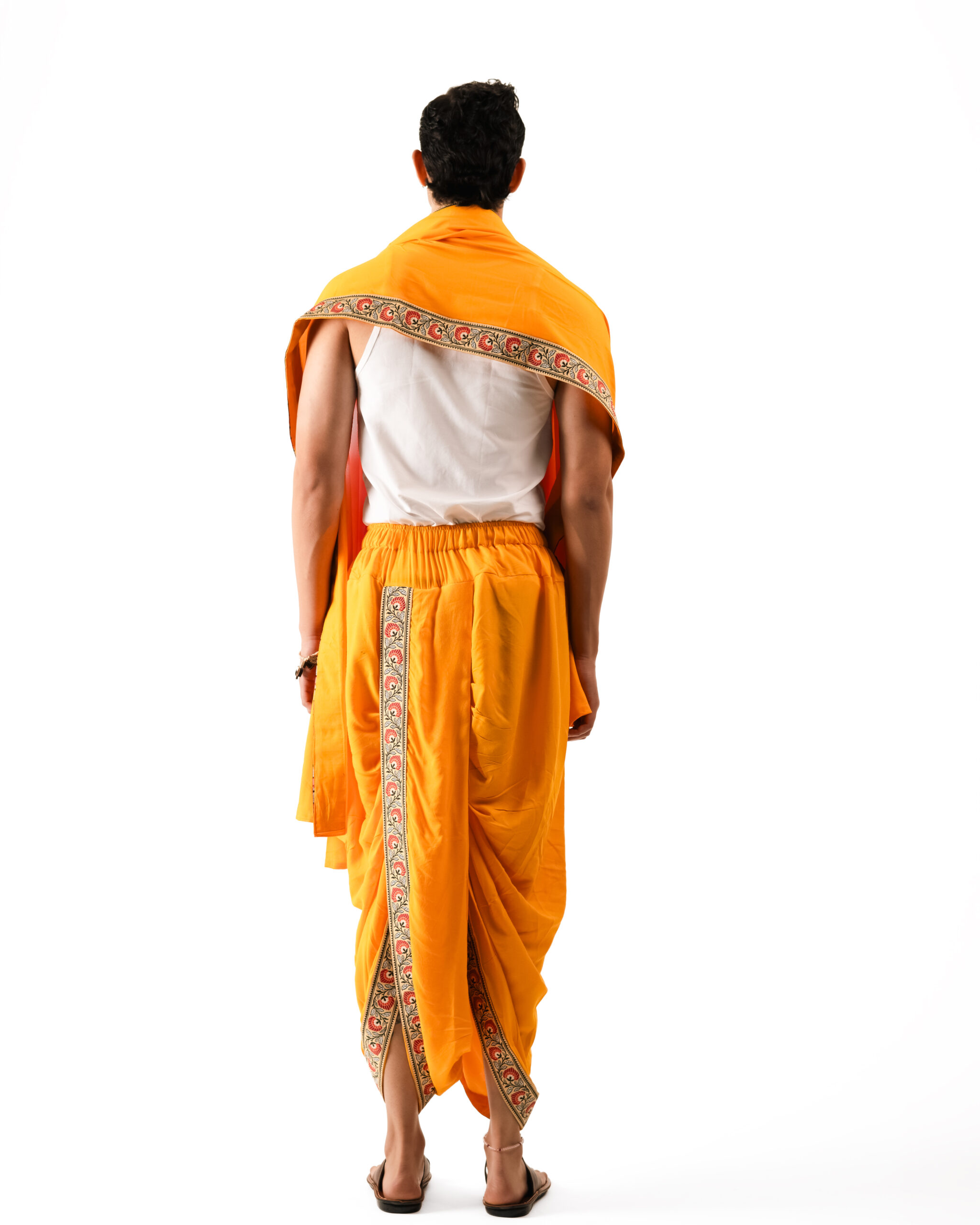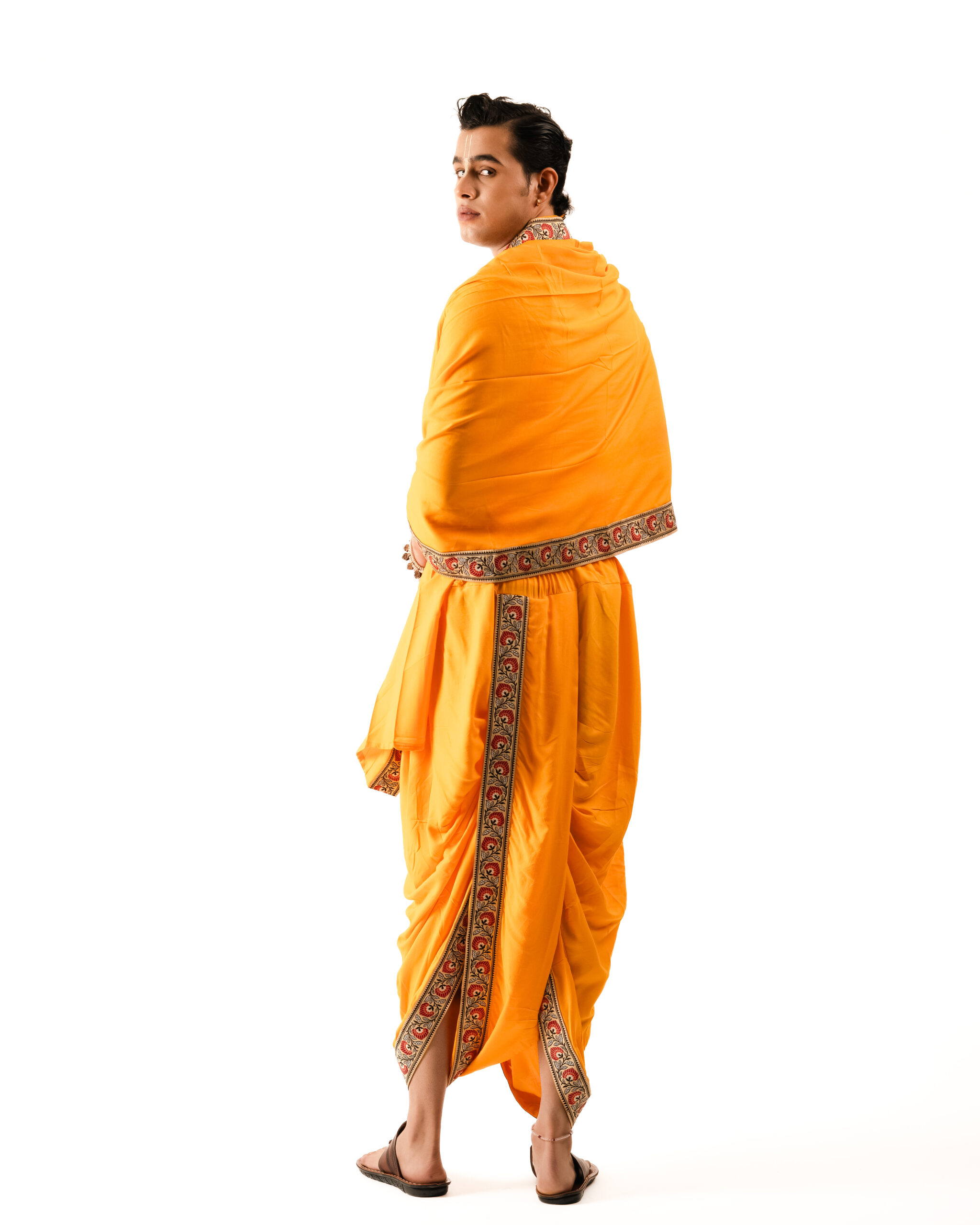 बगलपुरी कपड़े से बनी यह धोती और दुपट्टा परंपरा और आधुनिकता का खूबसूरत संगम है। आम्बर रंग और कढ़ाई से सजे बॉर्डर में शिल्पकला की बारीकी झलकती है। यह सेट हर अवसर पर आराम, शिष्टता और संस्कृति का अद्भुत संगम प्रस्तुत करता है।