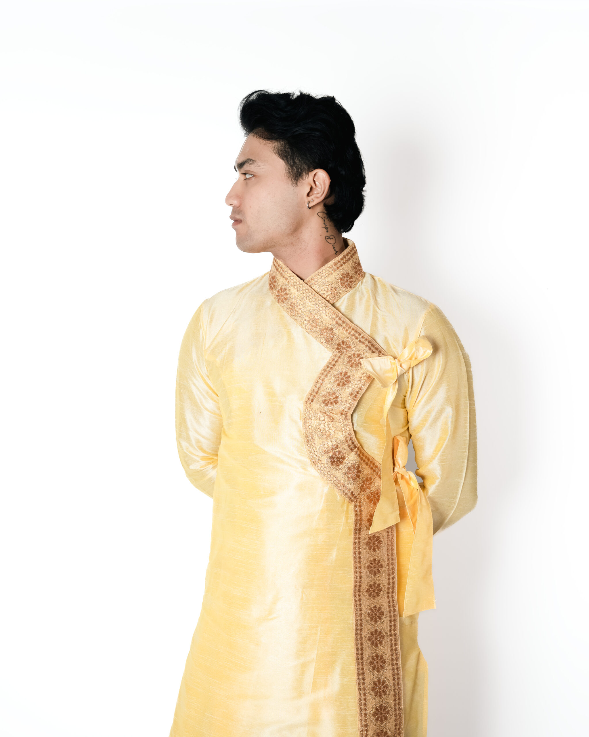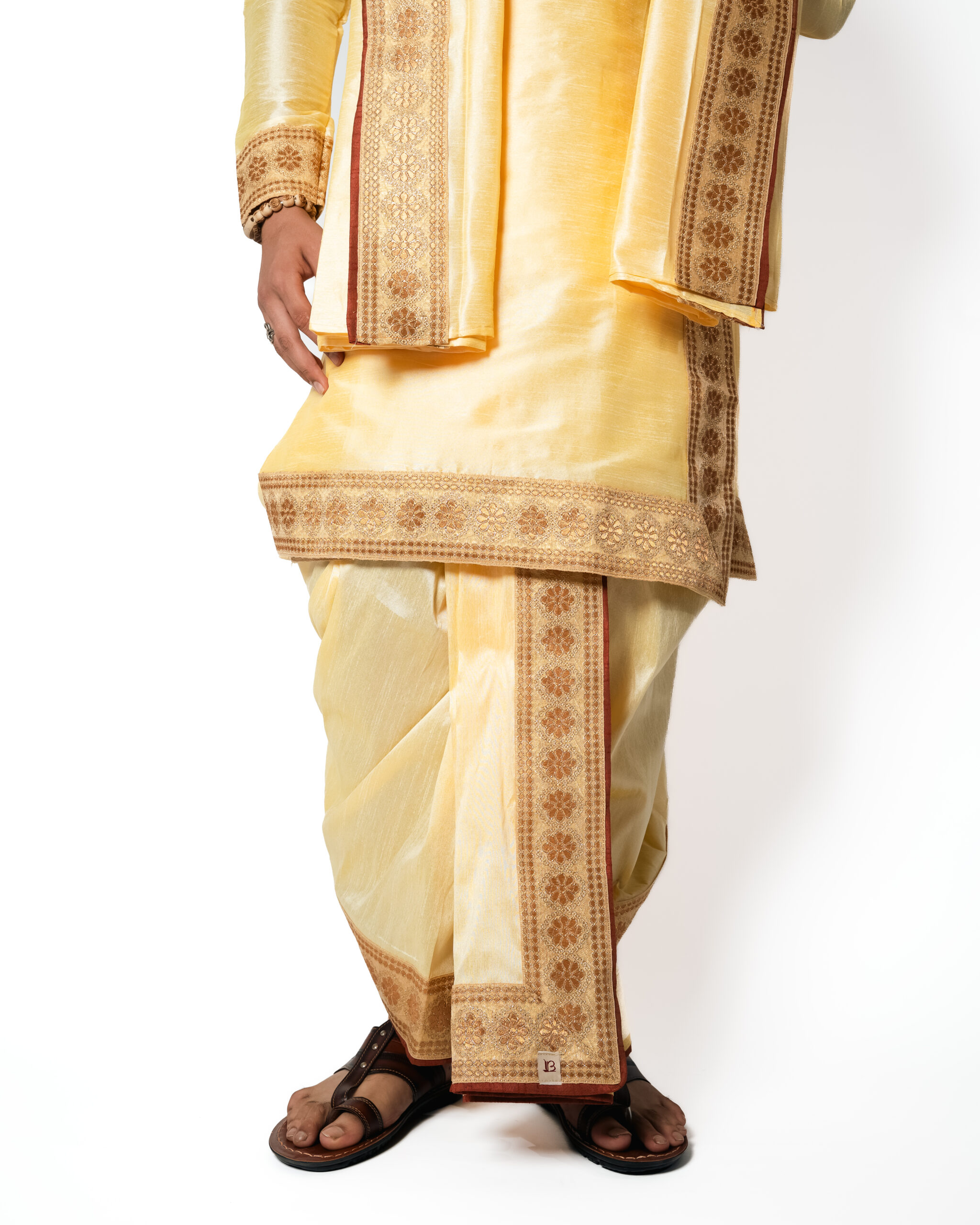 Includes: One Bagalbandhi, One Dhoti, and One Dupatta. हिरण्य सेट पारंपरिक शालीनता और सुंदरता का संगम है। क्रीम डुपियन सिल्क पर सुनहरी लेस और महीन मरून पाइपिंग का संयोजन इसे एक हल्का, परंतु राजसी रूप देता है।