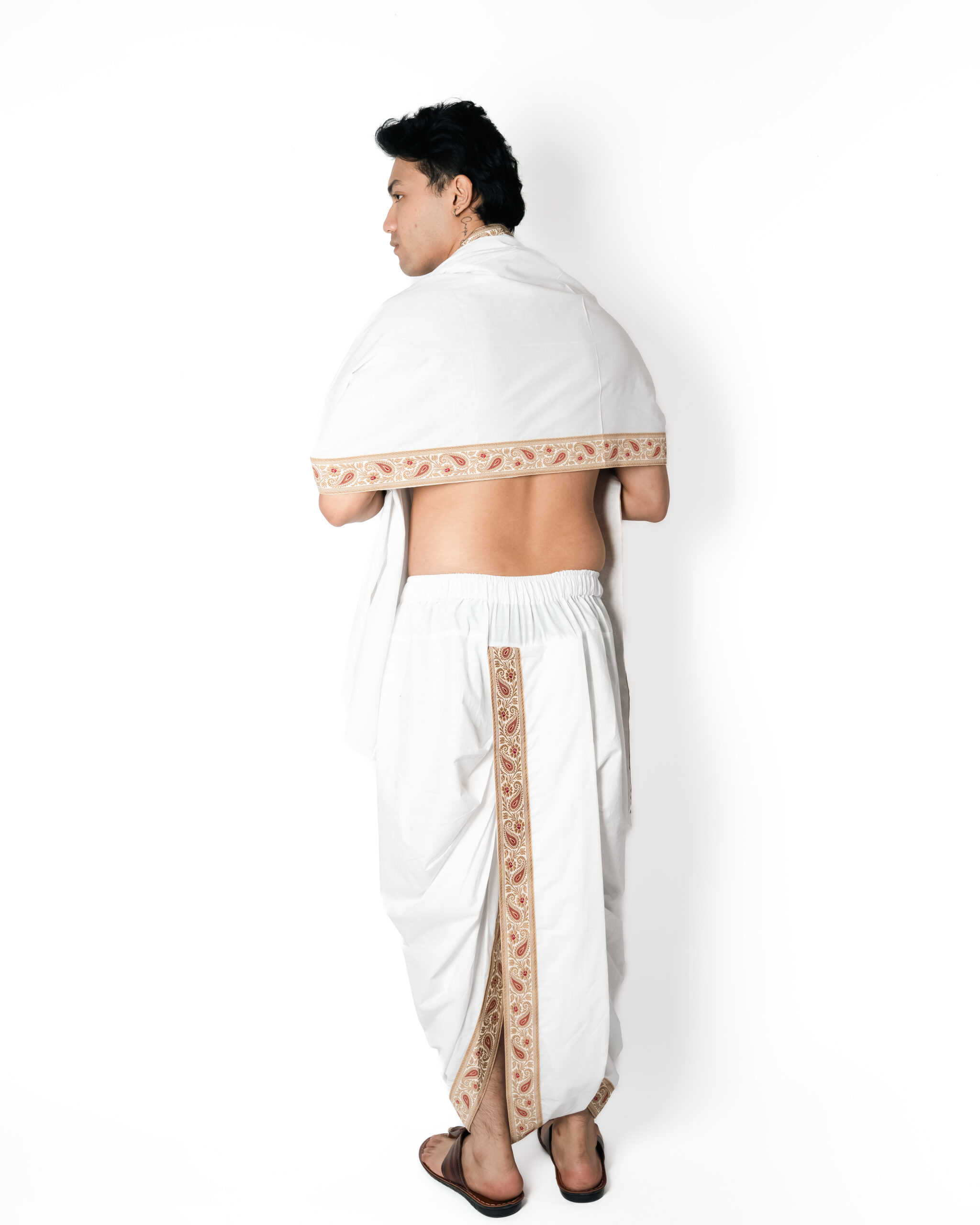 Includes: One Dhoti and One Dupatta. कैरव धोती-दुपट्टा सेट अपनी शुद्धता और पारंपरिक बुनावट से भारतीय सौंदर्य की झलक दिखाता है। मुलायम कॉटन कपड़ा दिनभर का आराम देता है, जबकि बारीक कैरी बॉर्डर इस साधारण परिधान को शालीनता से भर देती है। यह सेट पूजा, उत्सव या किसी भी पारंपरिक अवसर के लिए उपयुक्त है — धारणिया की उस सोच को दर्शाता हुआ, जहाँ परंपरा सहजता में बसती है।