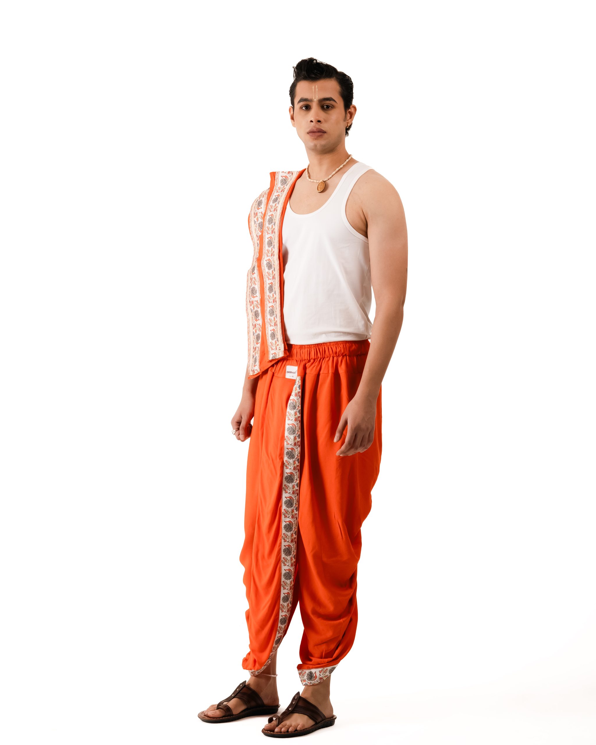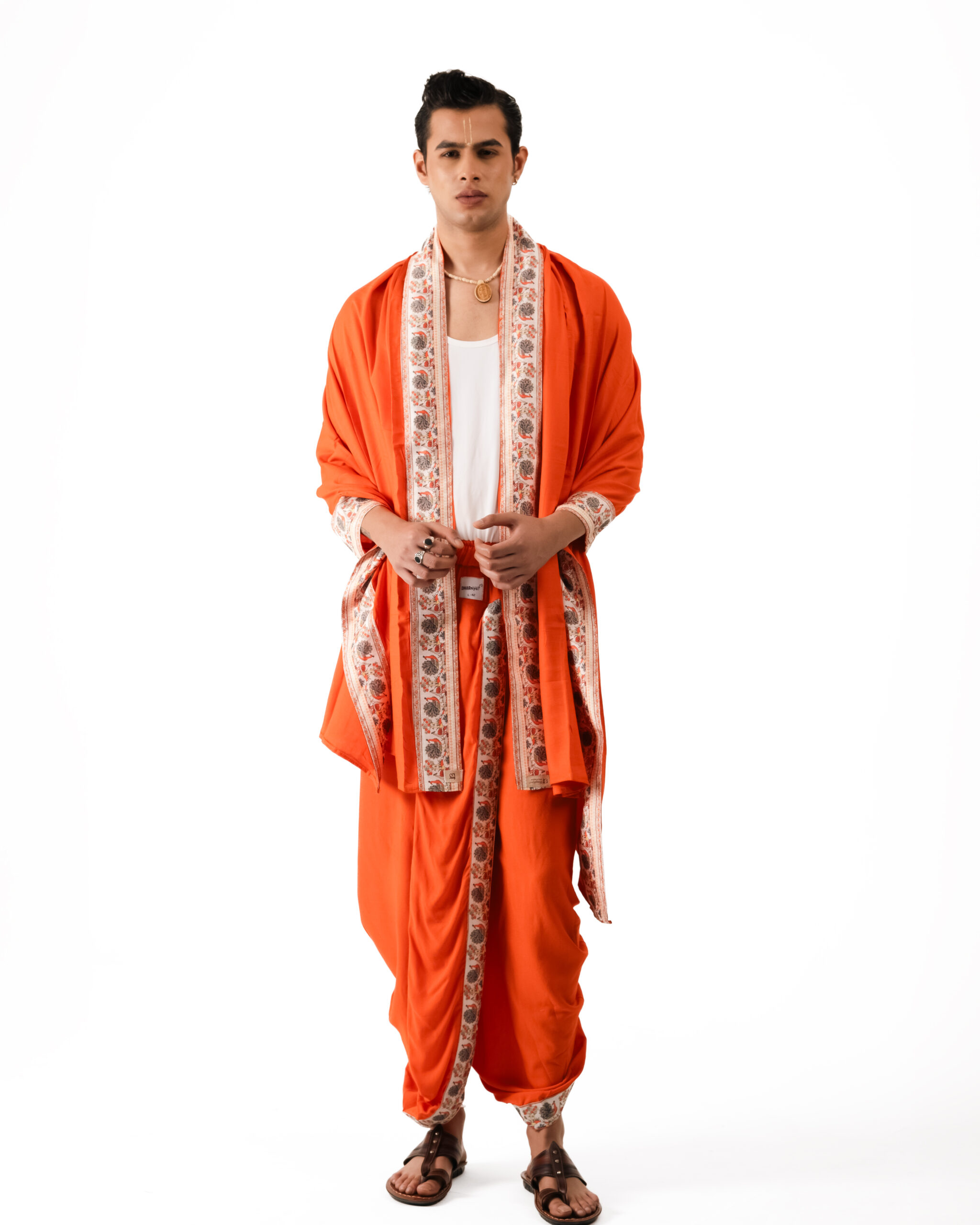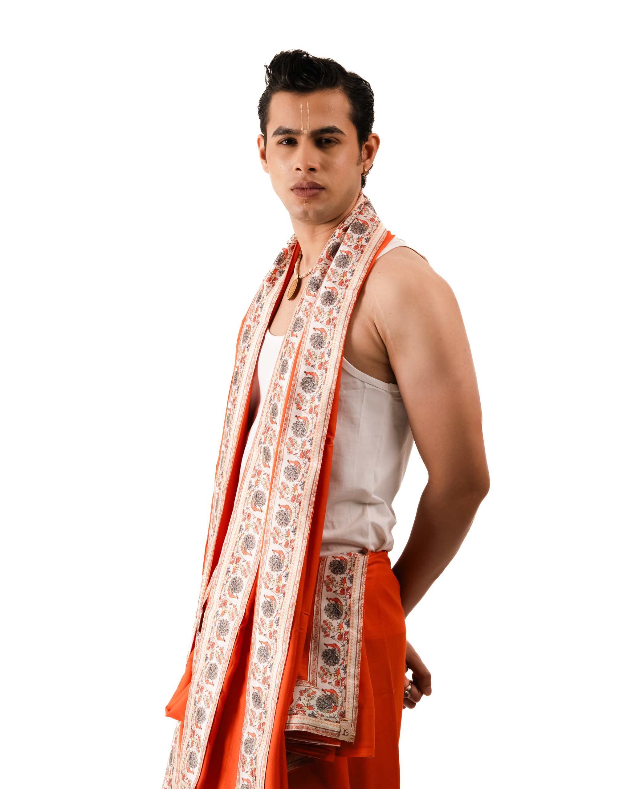 इस सेट में धोती और दुपट्टा हैं। चिकने बगालपुरी रेयॉन कपड़े से बना यह सेट पहनने में बेहद आरामदायक है। इसके नारंगी रंग और किनारी पर बने मोर के जोड़े ऊर्जा, सुंदरता और प्रेम का प्रतीक हैं। यह सेट त्योहारों, सांस्कृतिक आयोजनों या परंपरा से जुड़ी खास शान के लिए उपयुक्त है।