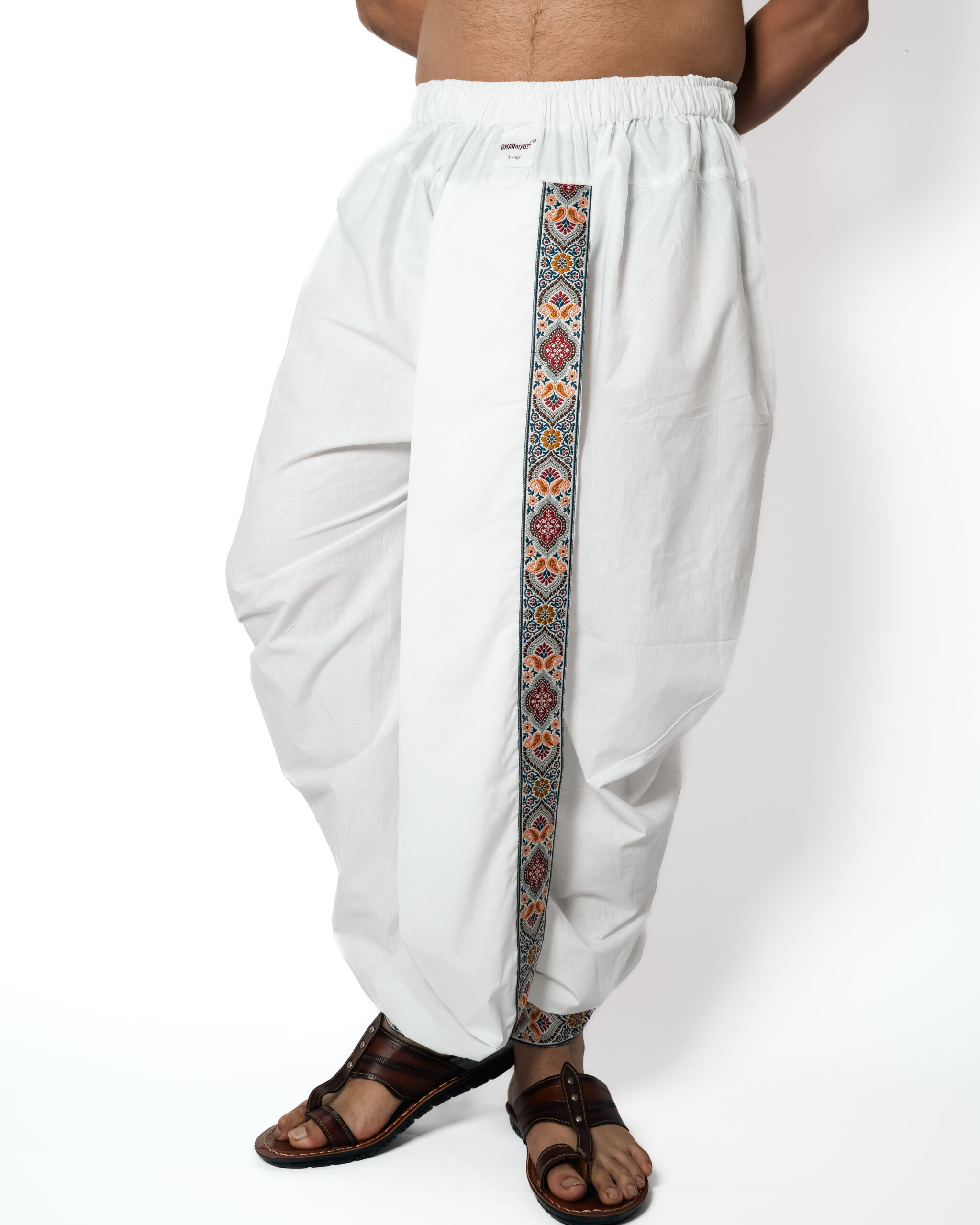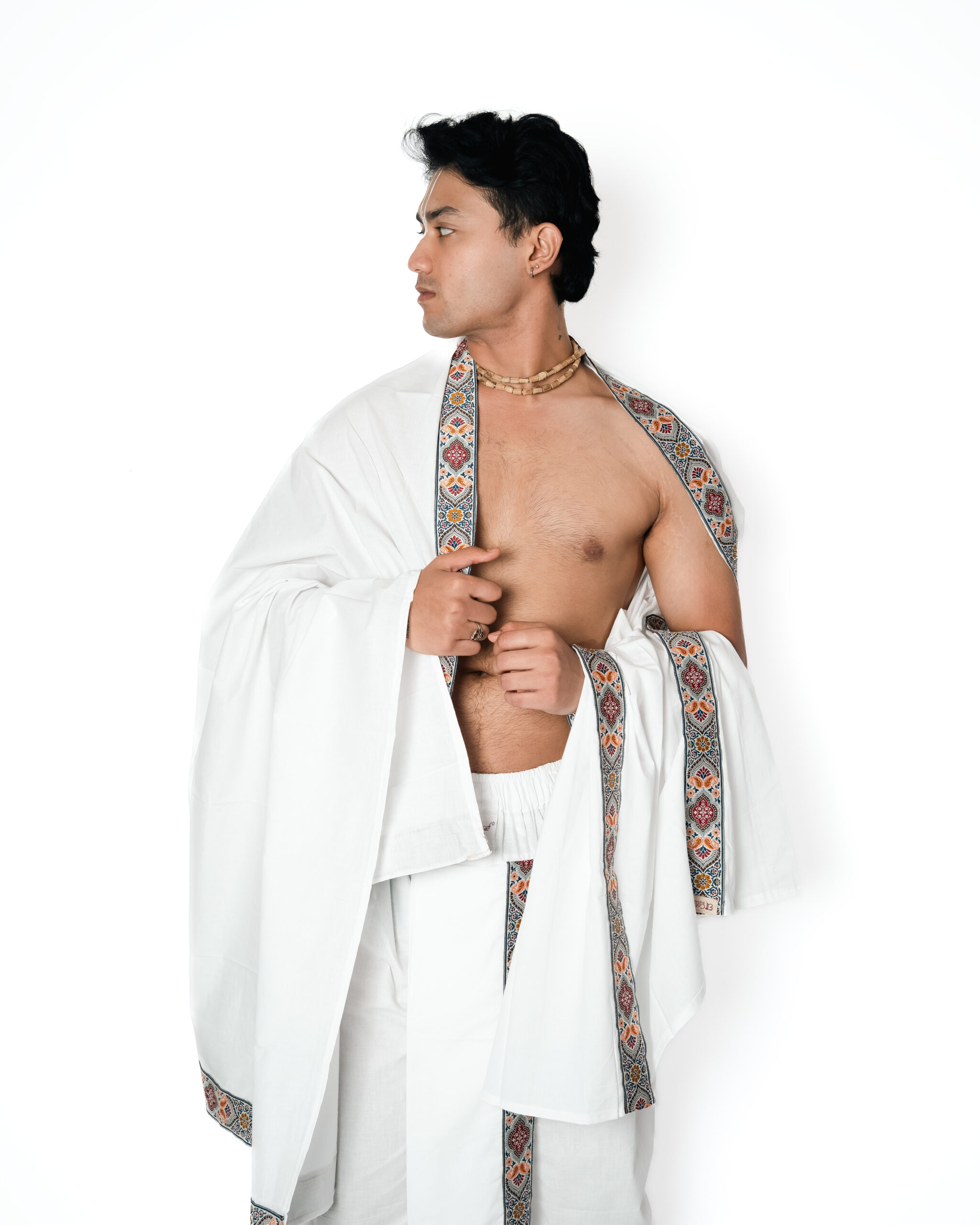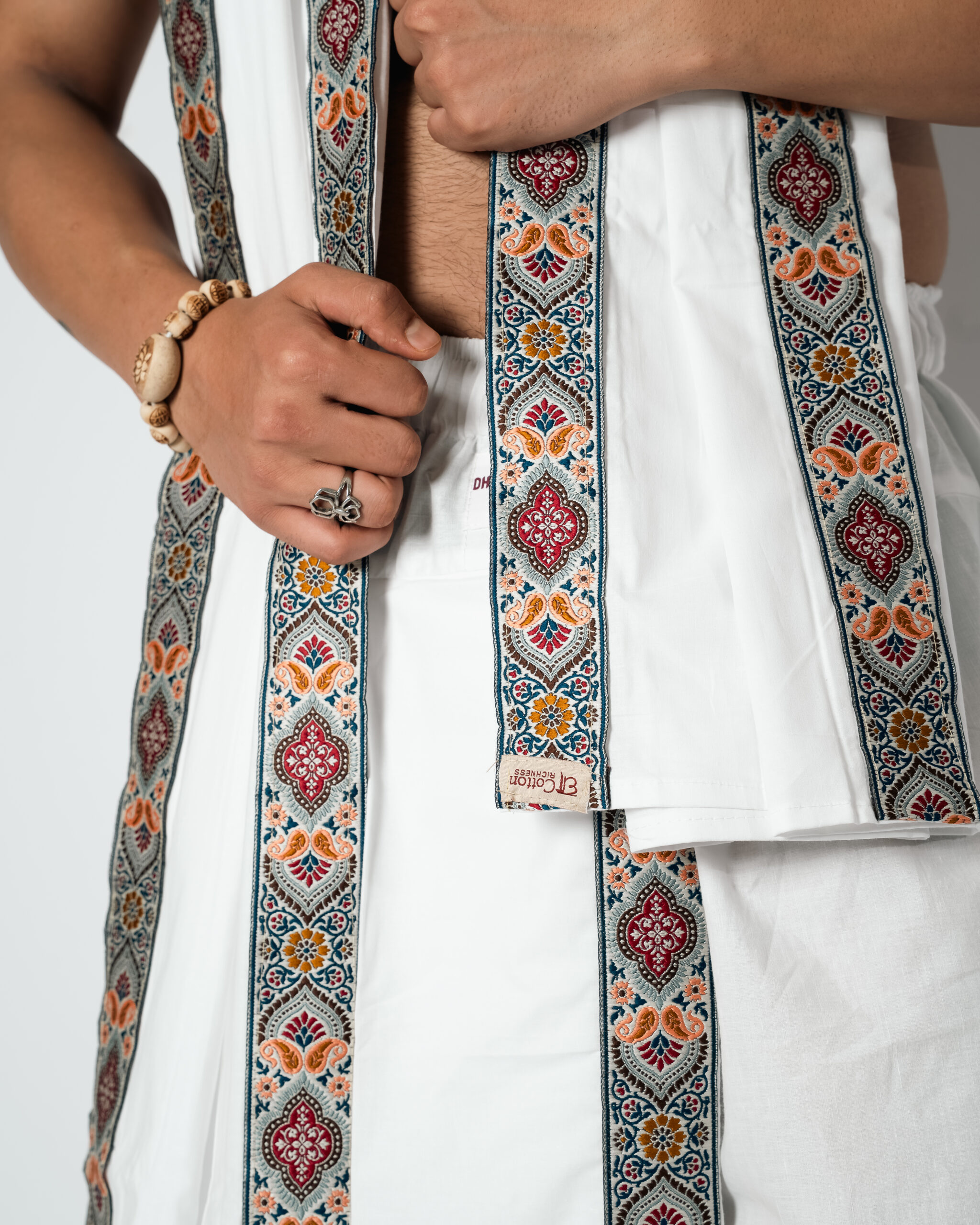 Includes: One Bagalbandhi, One Dhoti, and One Dupatta. मन्दर सेट सादगी और बारीकी का सुंदर मेल है। मुलायम कॉटन कपड़ा सहज आराम और प्राकृतिक गिरावट प्रदान करता है। इसके मंडलाकृति बॉर्डर पूर्णता और संतुलन का प्रतीक हैं, जबकि सफेद रंग पवित्रता और शांति को दर्शाता है।