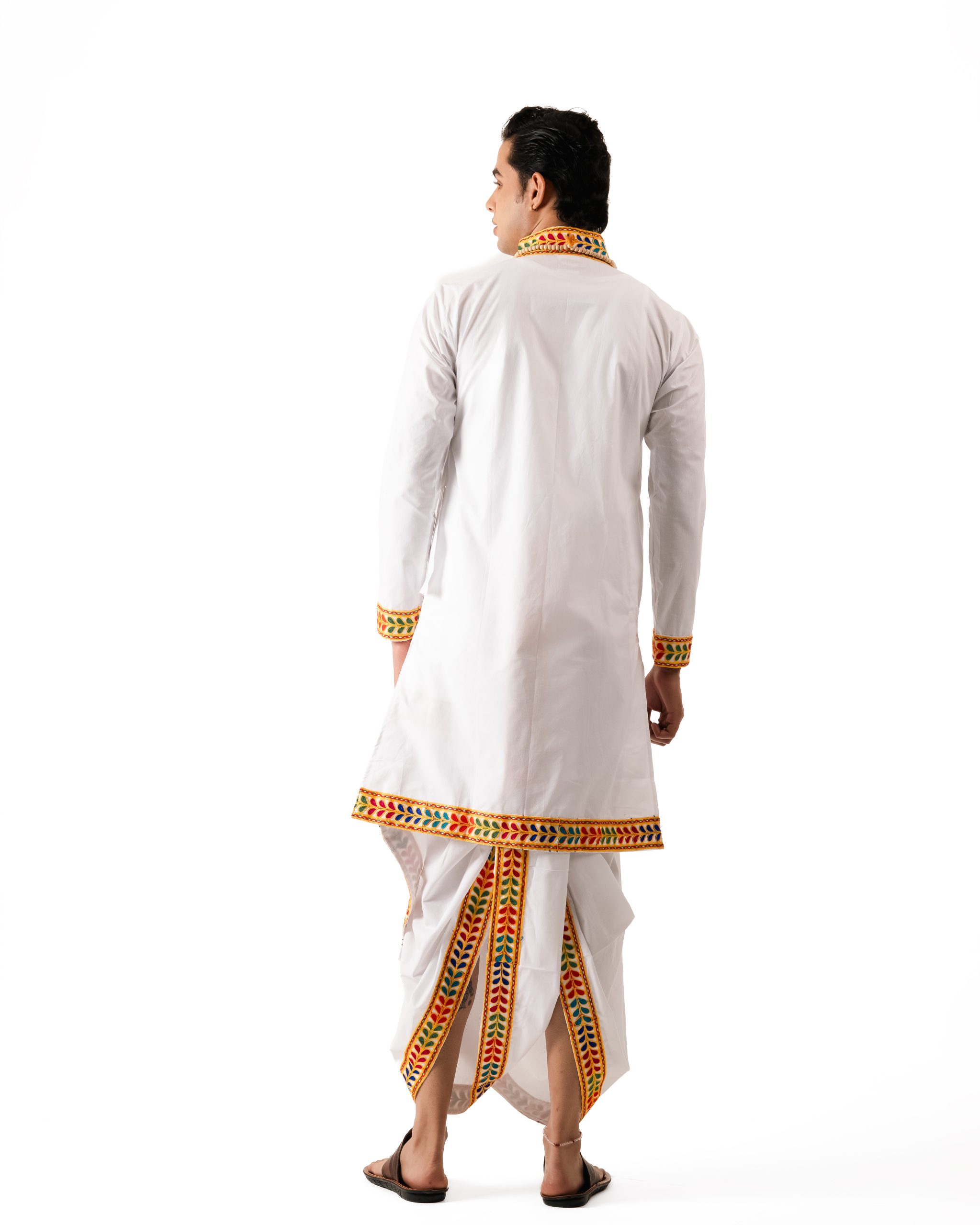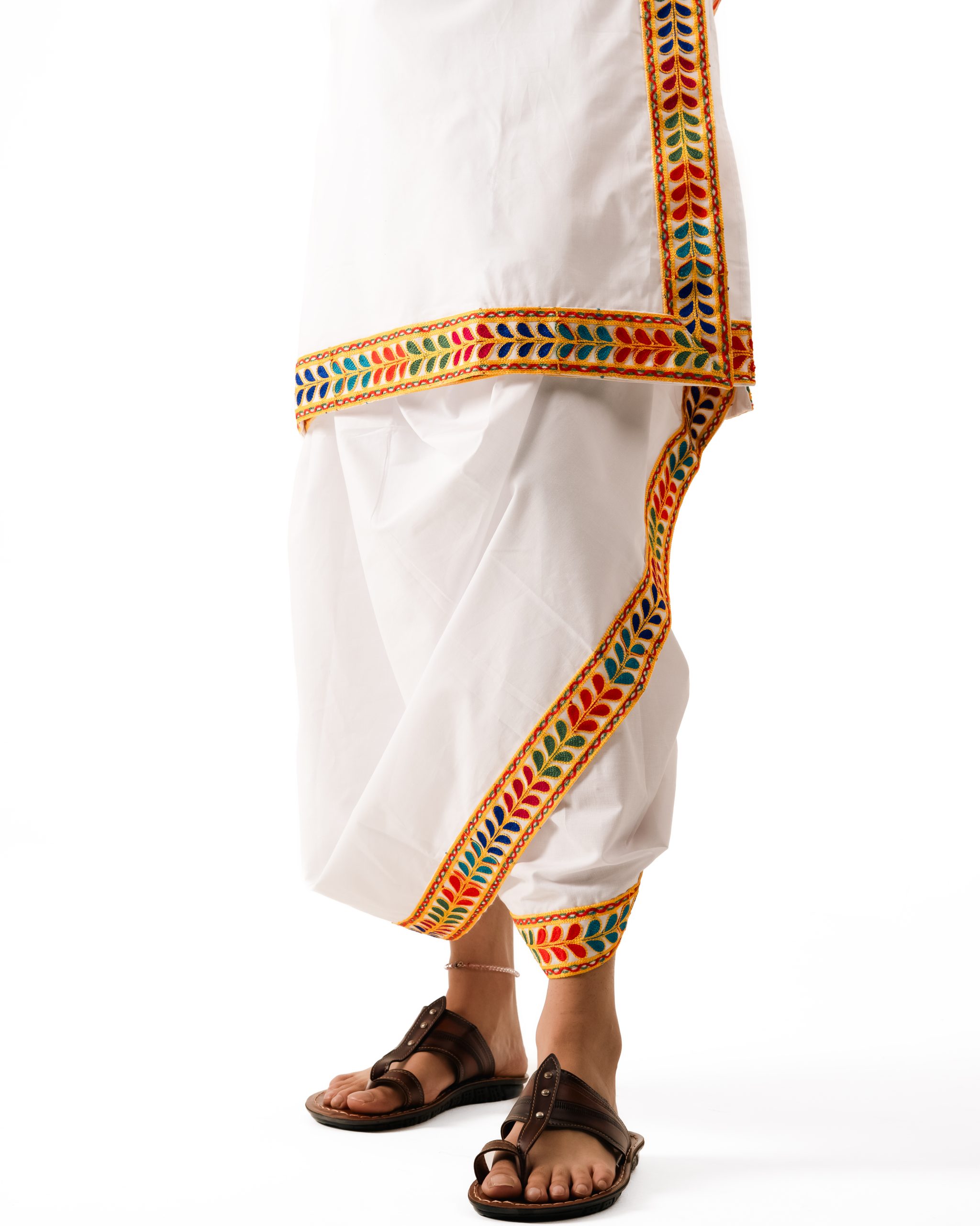 The Pavitra Set (Bagalbandhi ensemble) expresses purity, craftsmanship, and luminous heritage. Woven in soft, breathable cotton, its crisp white fabric flows with comfort and grace. Gujarati chaniya-choli style borders add vibrant folk motifs, bringing festivity and ornate detail steeped in tradition. Celebrating elegance in simplicity, every border and fold reflects handcrafted artistry. Ideal for cultural celebrations, temple visits, or festive days, the ensemble radiates calm colors and bold craft—each movement echoing Dharniya’s philosophy of living heritage in motion.